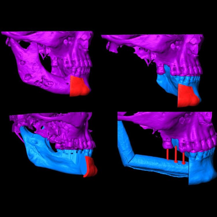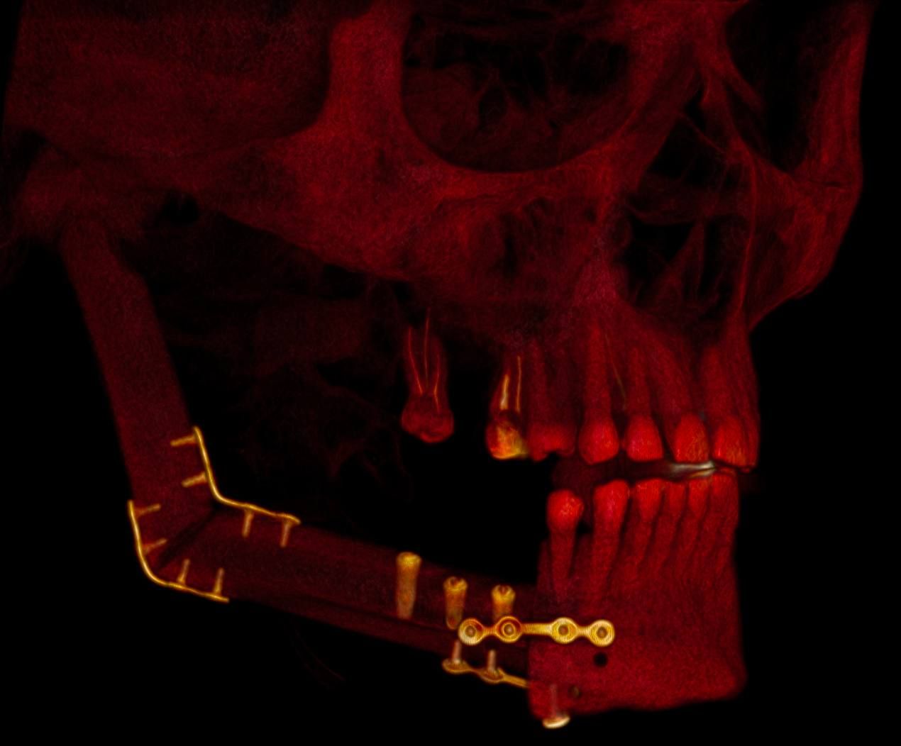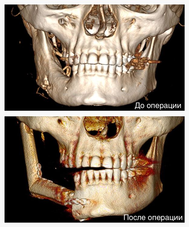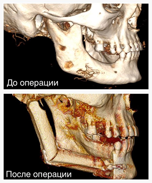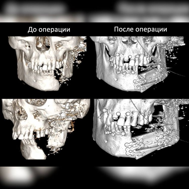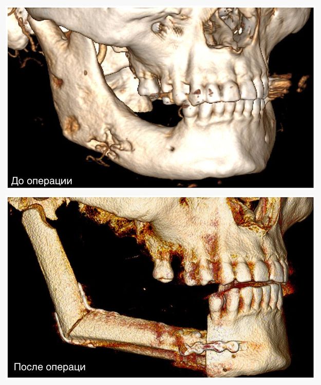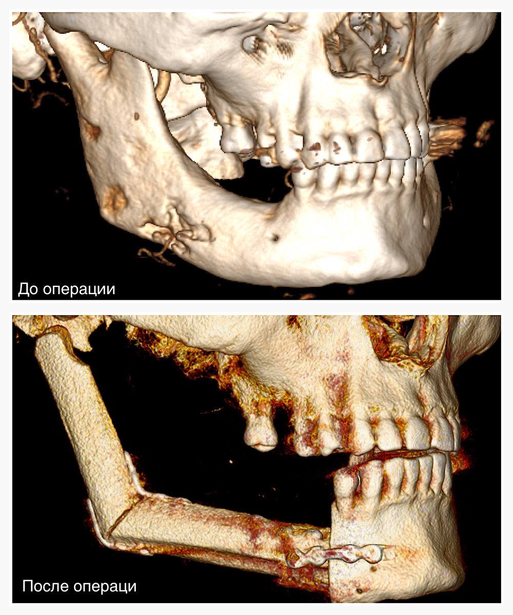 После тщательного обследования хирурги Центрального научно-исследовательского института стоматологии и челюстно-лицевой хирургии диагностировали продуктивный остемиелит нижней челюсти и провели резекцию нижней челюсти в пределах здоровых тканей. Образовавшийся дефект был устранён реваскуляризированным малоберцовым аутотрансплантатом. Одномоментно проведена детальная имплантация.
