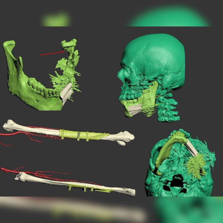 Устранили дефект нижней челюсти с помощью аутотрансплантата малоберцовой кости на сосудистой ножке. Его смоделировали так, чтобы вернуть исходную форму и высоту нижней челюсти.